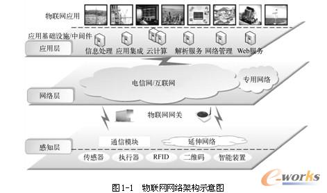 3)应用(服务)层则主要包含各类应用服务,例如监控服务、智能电网、工业信息化、绿色农业、智能家居、环境保护、公共安全等应用和服务。应用层还包括了中间件层,主要实现了网 络层与物联网应用服务间的接口和功能调用平台,包括对业务的分析整合、信息共享、智能处理、网络管理等,具体体现为一系列业务支撑平台、管理平台、信息处理平台、智能计算平台、 信息服务平台等。