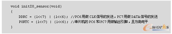 由于串口的初始化在实验一已经介绍,这里主要介绍高精度传感器的初始化。因为高精度温湿度传感器只需要将DATA引脚和CLK引脚与单片机相连,所以使用单片机的PC6和PC7引脚分别连接传感器的CLK和DATA口,并且只要单片机给PC6和PC7发送相应的时序就能控制高精度温湿度传感器。单片机对传感器I/O口的初始化代码如下: