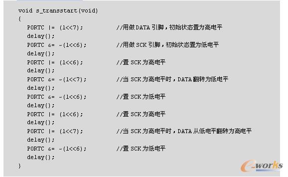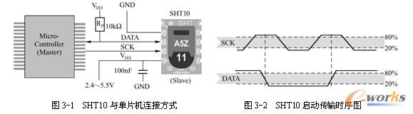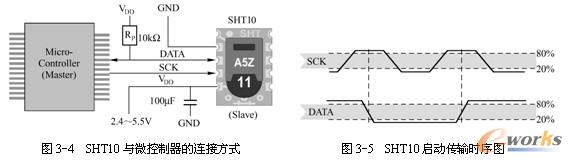 要驱动SHT10进行采样必须发送如下命令:首先,微控制器向SHT10发送“启动传输”时序,来完成数据传输的初始化。如图3-5所示,时序包括当SCK时钟高电平时DATA翻转为低电平,紧接着SCK变为低电平,随后在SCK时钟高电平时DATA翻转为高电平。初始化之后,微控制器便可以向SHT10发送命令。通常的命令包含3个地址位(目前只支持“000”)和5个命令位,具体将在后面结合代码进行介绍。SHT10会以下述方式表示已正确地接收到指令:在第8个SCK时钟的下降沿之后,将DATA下拉为低电平,并且在第9个SCK时钟的下降沿之后,将DATA位恢复为高电 平。