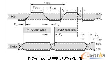 启动时序完成之后,SHT10便会以串行数据方式与单片机进行通信,时序图如图3-3所示。DATA三态门用于数据的读取,DATA在SCK时钟下降沿之后改变状态,并仅在SCK时钟上升沿有效。数据传输期间,在SCK时钟高电平时,DATA必须保持稳定。为避免信号冲突,单片机应驱动DATA在低电平。