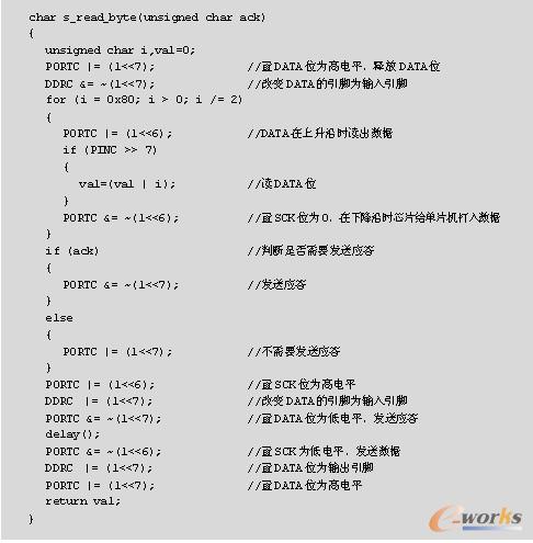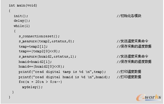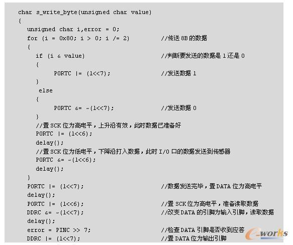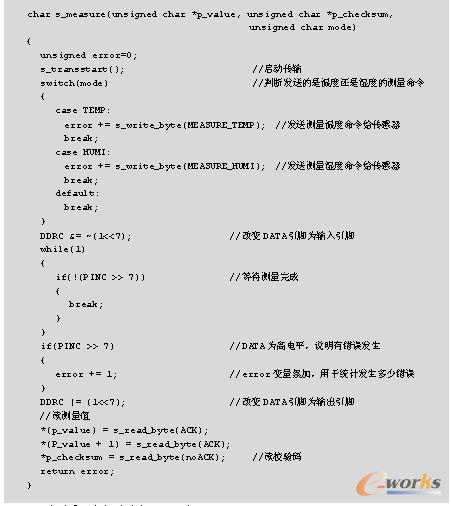 温湿度测量的过程如下:单片机发布一组测量命令后(“00000101”表示测量相对湿度,“00000011”表示测量温度),传感器开始采集数据。对应8/12/14bit 3种不同的测量,这个过程分别需要大约20/80/320ms。SHT10通过下拉DATA至低电平并进入空闲模式,表示测量的结束。单片机在触发SCK时钟来读出数据前,必须等待这个“数据备妥”信号。检测数据可以先被存储,这样单片机可以继续执行其他任务,在需要时再读出数据。在收到“数据备妥”信号之后,传输2B的测量数据和1B的CRC奇偶校验。单片机需要通过下拉DATA为低电平,以确认每字节。在测量和通信结束后,SHT10自动转入休眠模式。温湿度测量的相关代码如下: