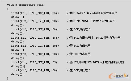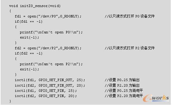 这部分主要是对微控制器和高精度温湿度传感器的连接引脚初始化。因为高精度温湿度传感器只通过DATA和SCK这两个引脚与微控制器通信,所以使用微控制器的P0.25和P2.20引脚分别连接传感器的DATA和SCK口。由于mClinux将所有的设备都当做文件进行处理,因此对微控制器的P0.25和P2.20引脚的处理是使用GPIO的相关I/O函数进行操作(详见GPIO驱动程序)。初始化代码如下: