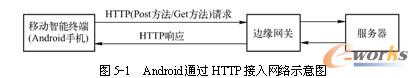 Android平台手机可以通过GSM、CDMA、3G网络和WiFi等无线网络接入Internet。Android平台手机主要是通过HTTP请求和发送数据到服务器端,使用HTTP请求和发送数据有两种方式,一种是Get方法;一种是Post方法。Get是用来从服务器上获得数据;而Post是用来向服务器传递数据。Get方式不安全,因为传输过程中,数据请求放在请求的URL中;而Post的所有操作对用户来说都是不可见的,因此安全性较高。另外,受URL长度的限制,Get传输的数据量较小;而Post则可以传输大量的数据。在编写程序实现上,Get方法相对来说简单一点;Post方法相对于Get方法稍显复杂。在本实验中采用Post方法。图5-1为Android通过HTTP接入网络的示意图。