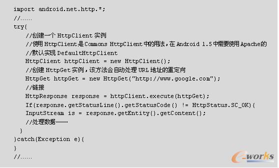 3)HttpResponse。HttpResponse是一个HTTP连接响应,当执行一个HTTP连接后,就会返回一个HttpResponse,可以通过HttpResponse获得一些相应信息。请求一个HTTP连接并获得连接请求是否成功的代码如下: