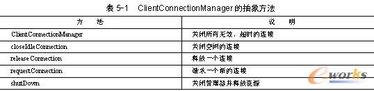 1)ClientConnectionManager接口。ClientConnectionManager是客户端连接管理器接口,它提供了几个抽象方法,如表5-1所示。