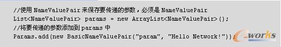 使用Post方式,需要使用NameValuePair来保存将要传递的参数,这里使用BasicNameValuePair来构造一个要被传递的参数params,然后通过add方法添加这个参数到NameValuePair中,代码如下:
