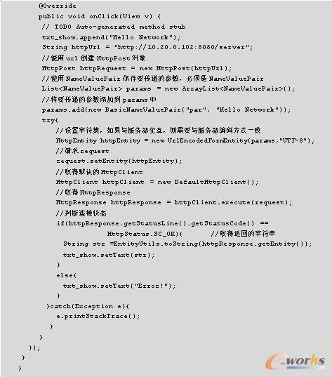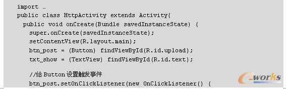 主程序HttpActivity类继承自Activity类,重写了void onCreate(Bundle savedInstanceState)方法。在onCreate方法通过setContentView(R.layout.main)设置Activity要显示的布局文件,该方法也是程序的入口。上面介绍的使用Post方法访问Internet的代码均包含在该函数中。其代码如下: