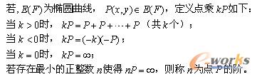 已知K和KP,求解K的问题称为椭圆曲线离散对数问题(ECDLP)。当点P的阶为大素数时, ECDLP的计算是不可行的(即椭圆曲线离散对数问题的难解性)。