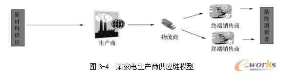 供应链中的时滞效应似乎很少有专门的学术著作或是理论来探讨和研究。也许是因为时滞效应的形成太过于稀松平常,任何人都能一眼看出来,并且也都明白时滞形成的原因。因为我们都知道产品的生产需要时间,产品的原材料准备需要时间,产品生产完成后从工厂到销售终端也需要时间。这一切的物理形态与空间位置的转换都是需要一定的时间来完成的。然而,在现实的交易中,每个消费者都希望自己的需求能在付款的那一刻就能得到及时的满足。然而时滞效应是天然的、无可避免的,除非有孙悟空的七十二般变化。否则,为了能及时满足消费者需求,生产商必须提前准备好产品。所以销售商为了弥补生产到产品交付的时滞,必须提前向生产商下产品订单;生产商为了满足终端零售的需求,必须提前进行产品生产;原材供应商为了满足生产商的需求必须提前进行原材 料的准备。而所有的提前运作都是基于对下游的需求预测而作出的反应,可是,预测永远都是预 测,不可能百分之百地符合未来的需求,因此每个环节就必须在供应链上设置一定量的库存来弥补 预测与真实需求之间的差异。而这种差异的累积,最终就为牛鞭效应的爆发而埋下种子。为了说明时滞效应对供应链的影响,请参看一个真实的供应链运作案例,背景来自国内某大型家电生产商,企业的供应链基本模型如图3-4所示。