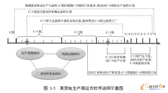 该家电生产商是由上游的原材料供应商直接对其进行原材料与零部件供应,生产商负责部分关 键部件生产和家电产品组装,生产商有自己的销售公司覆盖全国各地,销售终端有3种模式:自 营专卖店、大型电器连锁零售商以及大型商厦销售门店。销售终端由生产商当地的销售公司负责 协调和管理。补货模式为每周补货,生产商的短期执行计划就是自然周。由于原材料生产供应、 生产周期耗时以及物流补货耗时,生产商从开始进行需求预测到最终完成补货需要8周左右的时 间。具体运作时序说明示意图如图3-5所示。