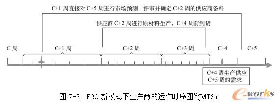 在新的模式下,企业不再因为由于离市场销售时间越近,订单预测越准确的原因,而需要将需 求预测与订单预测进行分离。所以生产商不再需要在每周给C+8周作需求预测,而可以直接对 C+5周作市场需求预测,即C+4周的生产量。对照图7-3,在C+1周作C+5周的市场需求预测,然 后直接经过有关部门的需求评审,评审结果就可以直接发送给相应原材料供应商,让原材料供应 商在C+2周进行原材料生产,在C+4周之前送到相应的各工厂。生产商则在C+4周进行C+5周的供 应生产,产品下线后就可以直接对C+5周的客户订单进行发货。