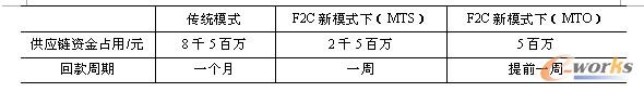 所以,在新的模式下,如果生产商采用MTO生产模式,那么在供应链上只需要占用5百万元资金而已,而且货款是提前收回的。对比传统模式与F2C新模式下的MTS以及MTO生产模式在关于供应链上资金占用情况以及回款周期,分析结果见表7-1。