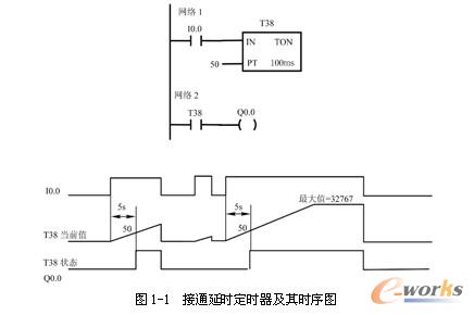 接通延时定时器的基本工作原理如图1-1所示:使能端(IN)接通时开始定时,当前值大于等于预设值(PT)时(PT=1~32767),定时器状态位置位,对应的常开触点闭合,常闭触点断开。达到预设值后,当前值仍继续计数,直到最大值32767为止。使能端断开,定时器状态位复位,当前值被清零。