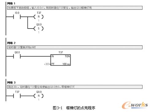 当按下楼梯灯的启动按钮I0.0时,连接到输出Q0.0的楼梯灯发光30s;如果在这段时间内又一次按下启动按钮,则重新开始计时30s,以确保最后一次按启动按钮时,楼梯灯30s内不会熄灭。