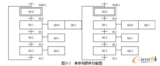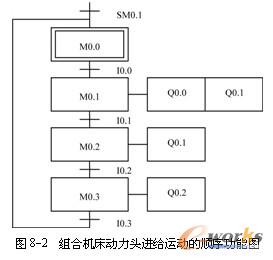 图8-2中,用M0.0~M0.3描述动力头进给运动的四个不同阶段,称为步,不同步之间的输出是不完全相同的;在每步的旁边标注了该步的动作,如M0.1描述的步的动作为Q0.0和Q0.1输出;通过转换条件描述步与步之间的转换,如由M0.0步转换到M0.1步的条件为I0.0=1。当某一步序标志为1时,表示该步为活动步,其动作有效;转换条件到来,则下一步变为活动步,此步变为不活动步。