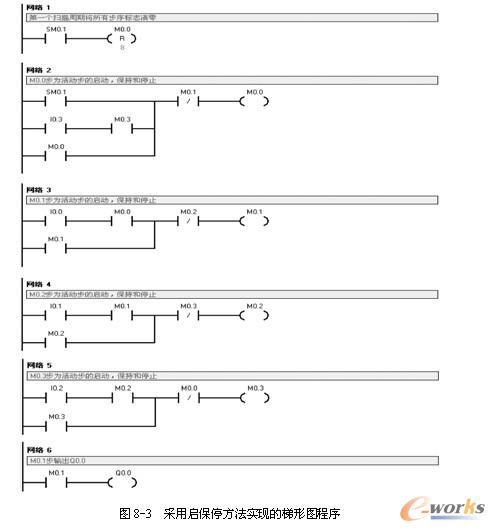 图8-3所示的梯形图是根据转换条件实现的步序标志的转换。由图8-2可知,M0.0变为活动步的条件是上电运行的第一个扫描周期(即SM0.1)或者M0.3为活动步且转换条件I0.3满足,故M0.0的启动条件为两个,即SM0.1和M0.3+I0.3;由于这两个信号是瞬时起作用,需要M0.0来自锁;当M0.0为活动步而转换条件I0.0满足时,M0.1变为为活动步而M0.0变为不活动步,故M0.0的停止条件为M0.1=1。故采用启保停电路即可实现顺序功能图中M0.0的控制,如图8-3所示的“网络2”。