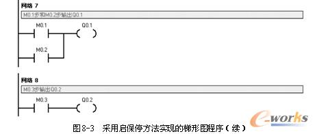 同理可以写出M0.1~M0.3的控制梯形图,如图8-3所示的“网络3”~“网络5”。图8-3中“网络6”实现了步M0.1输出Q0.0;M0.3步输出Q0.2,梯形图如图8-3中“网络8”所示;M0.1步和M0.2步都输出动作Q0.1,故梯形图如图8-3中“网络7”所示。
