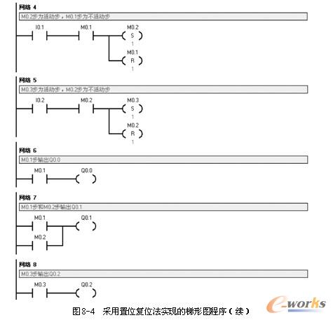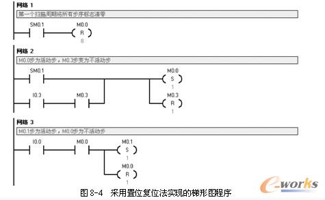 对于图8-2所示的单序列顺序功能图,还可以采用置位复位法编写梯形图程序,如图8-4所示。图8-4所示“网络1”的作用是初始化所有将要用到的步序标志,一个实际工程中的程序初始化是非常重要的。