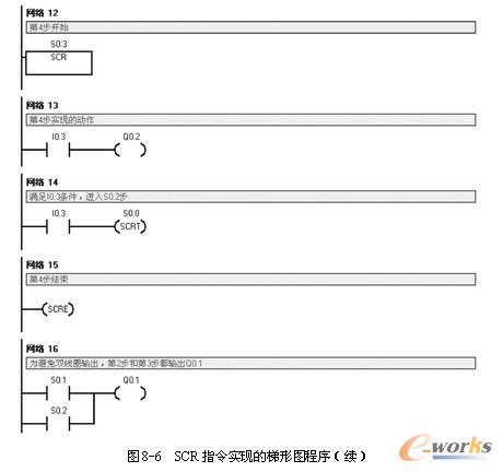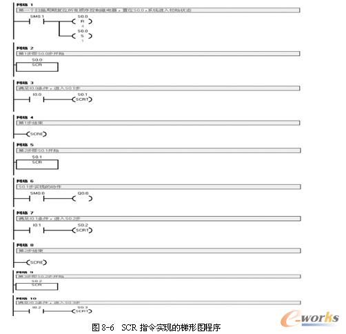 采用顺序控制继电器作为步序标志写出图8-2所示的单序列顺序功能图,如图8-5所示,SCR指令实现的梯形图程序如图8-6所示。