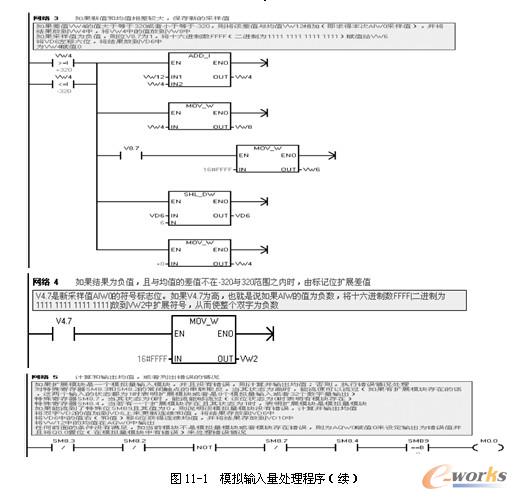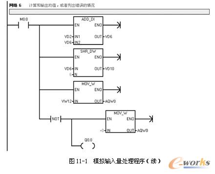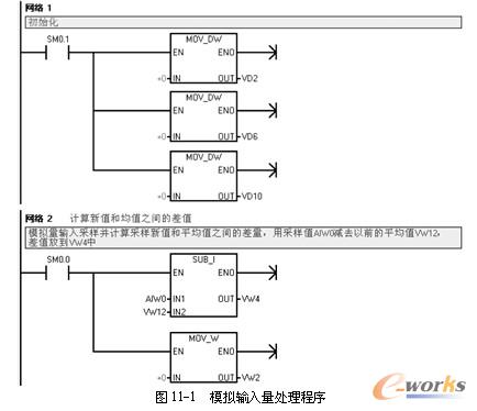 从模拟量输入AIW0中读取输入值,通过多次采样取平均值的办法来增加稳定度与精度。求取平均值时,用移位代替除法,同时,根据情况对结果进行处理。最终的平均值在AQW0中输出。