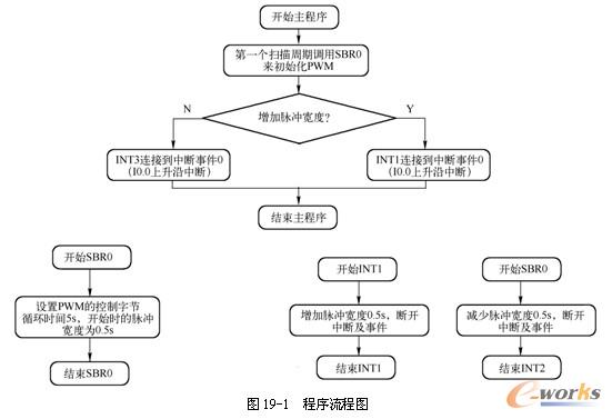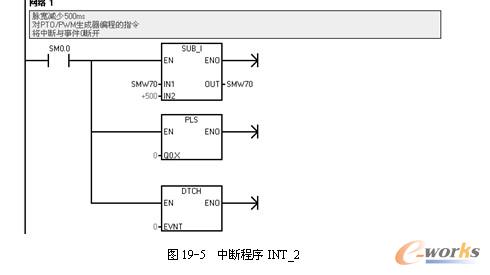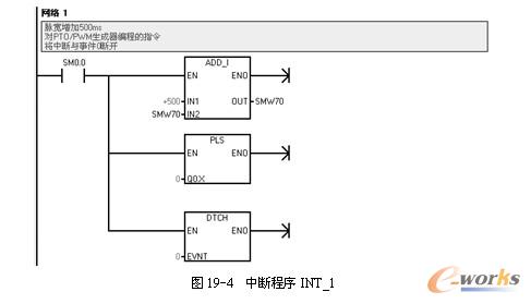 位存储器M0.0用来表明脉宽是增加还是减少,初始化时将这个标记设为增加。输出端Q0.0与输入端I0.0相连,这样输出信号就送到输入端I0.0。当第一个方波脉冲输出时,利用ATCH指令,把中断程序1(INT1)赋给中断事件0(I0.0的上升沿)。每个周期中断程序1将当前脉宽增加0.5s,然后利用DTCH指令分离中断INT1,使这个中断再次被屏蔽,如果在下次增加时,脉宽大于或等于周期,则将辅助内存标记位M0.0再次置0。这样就把中断程序2赋予事件0,并且脉宽也将每次递减0.5s。当脉宽值减为0时,将再次执行,初始化程序(子程序0)。