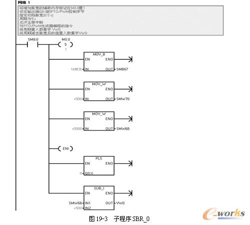 特殊存储字节SMB67用来初始化Q0.0的PWM,该控制字节包含PWM允许位,修改周期和脉宽的允许位,以及时间基数选择位等,本例由子程序0来调整这个控制字节。通过ENI指令,全局允许所有的中断,然后通过PLS指令,使系统接收各设定值,并初始化“PTO/PWM发生器”,从而在输出端Q0.0输出PWM信号。