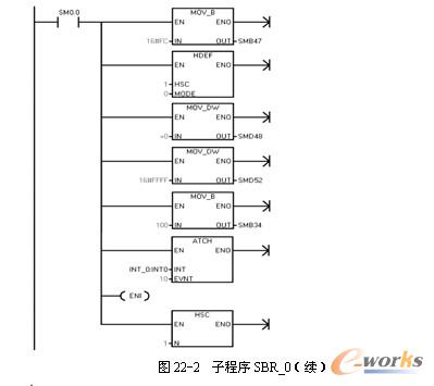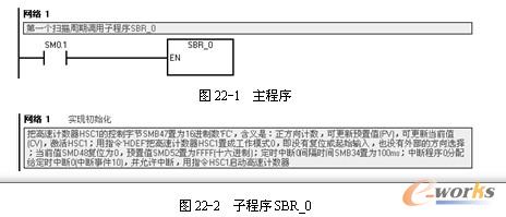本项目包括主程序和子程序SBR_0及中断子程序INT_0,即主程序在第一个扫描周期调用子程序SBR_0,SBR_0实现高速计数器和定时中断的初始化,INT_0为对高速计数器求值的定时中断程序。程序清单及注释如图22-1~图22-3所示。