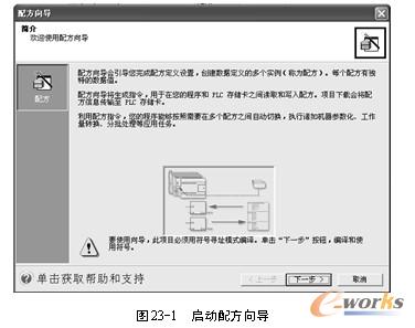 下面利用配方向导创建表23-1所示的配方。启动STEP 7 Micro/Win软件,在指令树中,单击“向导→配方”,打开配方向导,如图23-1所示。