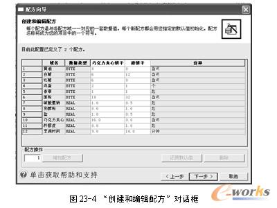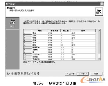 单击图23-1中的“下一步”按钮,如果已经存在配方,则进入图23-2所示的“现存配置”对话框,在此可以修改一个已有配方集或增加一个新配方集,如果没有存在配方集,则由图23-1进入“配方定义”对话框,如图23-3所示,在此定义一个配方集的数据域名(每一个名字都将成为项目中的一个符号名),选择数据类型,为每个名字输入默认值和注释,在该配方集中的所有新配方将使用这些默认值作为初始值。