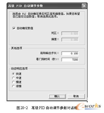 图28-2中,对于一般的PID系统,建议选中“自动确定数值”复选框,让自整定来自动计算死区值和偏移值。死区值规定了允许过程值偏离设定值的最大(正负)范围,过程反馈在这个范围内的变化不会引起PID自整定调节器改变输出,或者使PID自整定调节器“认为”这个范围内的变化是由于自己改变输出进行自整定调节而引起的。PID自整定开始后,只有过程反馈值超出了该区域,PID自整定调节器才会认为它对输出的改变发生了效果。这个值用来减少过程变量的噪声对自整定的干扰,从而更精确地计算出过程系统的自然振动频率。如果选用自动计算,则默认值为2%。如果过程变量反馈干扰信号较强(噪声大)自然变化范围就大,可能需要人为设置一个较大的值。但这个值的改变要与下面的偏差值保持1:4的关系。偏差值决定了允许过程变量偏离设定值的峰峰值。如果选择自动计算该值,它将是死区的4倍,即8%。有些非常敏感的系统不允许过程量偏离给定值很多,也可以人工设置为比较小的值,但是要和上述“死区”设置保持比例关系。这就是说,一个精度要求高的系统,其反馈信号必须足够稳定。