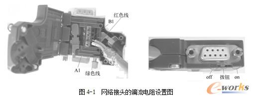 西门子PLC的PPI通信、MPI通信和PROFIBUS-DP现场总线通信的物理层都是RS-485通信,而且采用的都是相同的通信线缆和专用网络接头。西门子提供两种网络接头,即标准网络接头和编程端口接头,可方便地将多台设备与网络连接,编程端口允许用户将编程站或HMI设备与网络连接,而不会干扰任何现有网络连接。编程端口接头通过编程端口传送所有来自S7-200 CPU的信号(包括电源针脚),这对于连接由S7-200 CPU(例如SIMATIC文本显示)供电的设备尤其有用。标准网络接头的编程端口接头均有两套终端螺丝钉,用于连接输入和输出网络电缆。这两种接头还配有开关,可选择网络偏流和终端。图4-1显示了电缆接头的普通偏流和终端状况,两端的电阻设置为“on”,而中间的设置为“off”,图中只显示了一个,若有多个也是这样设置。要将偏置电阻设置“on”或者“off”,只要拨动网络接头上的拨钮即可。图4-1中拨钮在“on”一侧,因此偏置电阻接入电路。