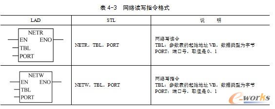 网络读取(NETR)指令,通过指定的端口(PORT)根据表格(TBL)定义从远程设备收集数据。NETR指令可从远程站最多读取16字节信息。网络写入(NETW)指令通过指定的端口(PORT)根据表格(TBL)定义向远程设备写入数据。NETW指令可向远程站最多写入16字节信息。可在程序中保持任意数目的NETR/NETW指令,但在任何时间最多只能有8条NETR和NETW指令被激活。例如,在特定S7-200中的同一时间可以有4条NETR和4条NETW指令(或者2条NETR和6条NETW指令)处于现用状态。网络读写指令格式见表4-3。