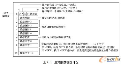 网络读写指令具有相似的数据缓冲区,缓冲区以一个状态字起始。主站的数据缓冲区如图4-3所示。远程站的数据缓冲区如图4-4所示。