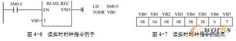 读实时时钟(TODR)指令从硬件时钟中读取当前时间和日期,并把它装载到一个起始地址为T的8字节时间缓冲区中。写实时时钟(TODW)指令将当前时间和日期写入硬件时钟,将当前时钟存储在以地址T开始的8字节时间缓冲区中。必须按照BCD码的格式编码所有的日期和时间值(例如,用16#97表示1997年)。图4-6给出了时间缓冲区(T)的格式,如果现在的时间是2008年4月8日8时58分38秒,星期六,则运行的结果如图4-7所示。年份存入VB0存储单元,月份存入VB1单元,日存入VB2单元,小时存入VB3单元,分钟存入VB4单元,秒钟存入VB5单元,VB6单元为0,星期存入VB7单元,可见共占用8个存储单元。