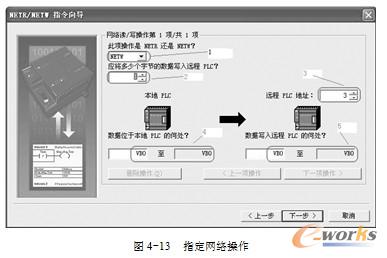 4)指定网络操作。图4-13所示的界面相对比较复杂,需要设置5项参数。在图中的位置选择“NETW”(网络写),因为本例中只要求主站把信息送到从站;在位置2输入1,因为只有1个开关量信息;在位置3输入3,因为第三站的地址为“3”;位置4和位置5保持默认值,然后单击“下一步”按钮。