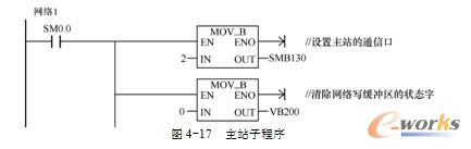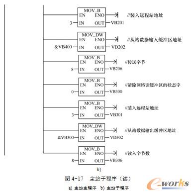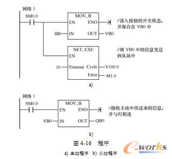 【关键点】本例的主站站地址为“2”,在运行程序前,必须将从站的站地址设置成“3”(与图4-12中设置一致),此外,本例实际是将主站的VB0中数据传送到从站的VB0中。此外,要注意站地址和站内地址的区别。主站和从站的波特率必须相等。一般而言,其他的通信方式也遵循这个原则,这点初学者很容易忽略。