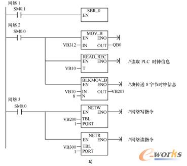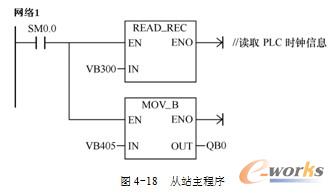 【例4-2】 某设备的第一站和第二站上的控制器是CPU 226CN,两个站组成一个PPI网络,其中,第一站的PLC为主站,第二站的PLC为从站。其工作任务是:将主站内保存的时钟信息用网络写指令写入从站的V存储区,把从站的存储区的时钟信息用网络读指令读到主站的V存储区,主站和从站分别把时间信息的“秒”用BCD格式传送到QB0字节上显示。请编写程序。