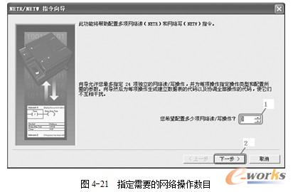2)指定需要的网络操作数目。在图4-21所示的界面中设置需要进行多少网络读写操作,由于本要进行三次读写操作,向站3读写各1次,向站4写1次,因此设为“3”即可,单击“下一步”按钮。