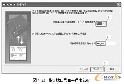 3)指定端口号和子程序名称。由于CPU226有0和1两个通信口,网络连接器插在哪个端口,配置时就选择哪个端口,子程序的名称可以不作更改,因此在图4-22所示的界面中直接单击“下一步”按钮。