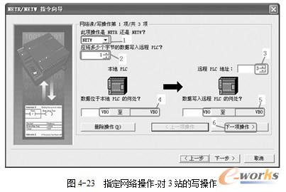 4)指定网络操作。对3站的网络写操作如图4-23所示,这个界面相对比较复杂,需要设置5项参数。在图中的位置选择“NETW”(网络写),因为本例中只要求主站把信息送到从站;在位置2输入1,因为只有1个开关量信息;在位置3输入3,因为第三站的地址为“3”;位置4和位置5保持默认值,然后单击“下一项操作”按钮。