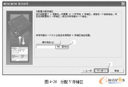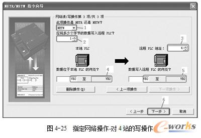 对4站的网络写操作如图4-25所示,在图中的位置选择“NETW”(网络写),因为本例中只要求主站把信息送到从站4;在位置2输入1,因为只有1个开关量信息;在位置3输入4,因为第三站的地址为“4”;位置4和位置5输入VB2,然后单击“下一项操作”按钮。