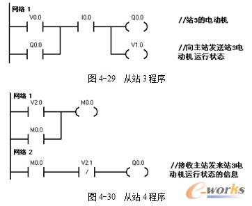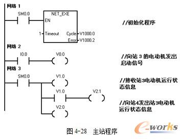 【例4-3】某设备有三台CPU 226CN,组成一个PPI网络,其中,第一站的PLC为主站,其余的PLC为从站。其工作任务是:当按下主站上的按钮SB1时,第二站上的电动机启动,一旦第二站上的电动机启动后停机,则第三站上的报警灯报警。请编写程序。