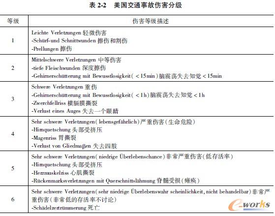 对于人体的力学承受极限,如骨折、器官损伤和其他的伤害都有一个程度上的分类,该分类就是为研究行人保护而设定的。美国联邦交通安全法中对受伤害程度进行了分级,见表2-2。