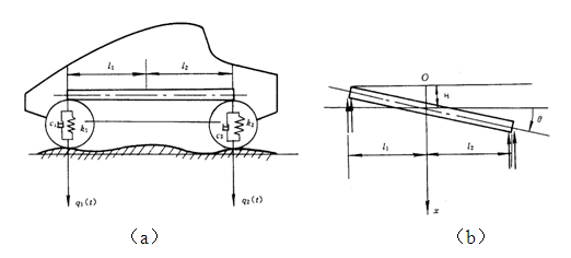 前面讨论的单质量和双质量系统都是双轴汽车的局部系统,只分析了单输入下车身的垂直振动,实际汽车还存在整体的垂直振动和俯仰振动。现在进一步讨论汽车垂直和俯仰两个自由度振动系统,在前、后车轮的两个路面不平输入下的强迫振动。