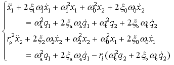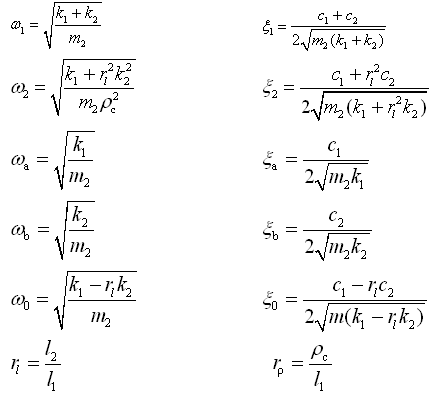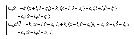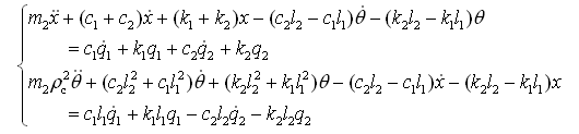 由于已知前、后悬挂的刚度κ1,κ2,阻尼c1,c2,车身质量m2,系统绕质心轴的转动惯量Jc=mρc2,质心到前后、悬挂的距离分别为ι1和ι2;设由于路面不平在前、后轮处产生的位移输入用q1(t)和q2(t)来表示;系统的坐标为质心偏离静平衡位置的铅垂距离x和绕质心的转角θ;x和θ的正向如图2-16(b)所示。根据图2-16(b)可写出车身的平面运动微分方程: