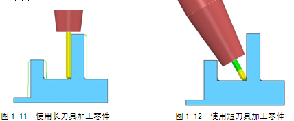 在零件加工过程中,使用的刀具悬出机床主轴越长,刀轴的偏摆量会越大,容易导致凸模欠切、凹模过切的情况,零件加工质量就会显著降低。如图1-11所示台阶零件,在三轴机床上,必须选用刀柄和刀刃都足够长的刀具才能切削成型。而使用五轴加工机床能在加工相同对象时,通过摆动刀轴从而实现使用短刀具加工出深长型腔或高陡峭壁的表面,如图1-12所示。