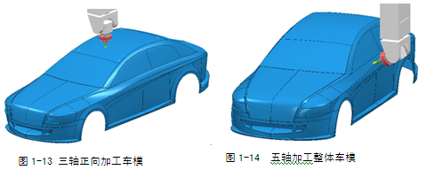 在加工诸如1:1整体车模、1:1风力发电机叶片(分段)等大型零部件时,由于模型侧壁往往较深且带有成型特征,必须使用五轴机床才能加工出产品。如图1-13所示整体车模,其高度一般都超过1m,并且车模侧围不是简单的平面,而是有凹凸不平的结构特征,使用三轴机床是不能完整加工出来的,而必须使用五轴机床通过调整刀具与工件的角度位置进行加工,如图1-14所示。