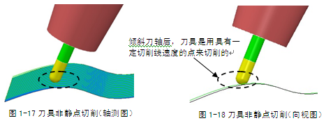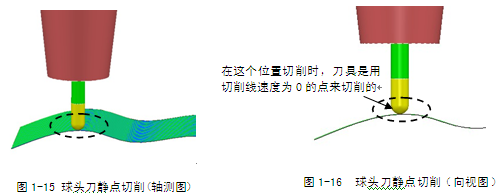 使用三轴机床加工复杂曲面时,通常采用球头铣刀。而球头铣刀是以点接触成形的,不仅切削效率低,而且由于刀具与工件间的位姿角在加工过程中不能改变,一般就很难保证用球头铣刀上的最佳切削点(即球头上线速度最高点)进行切削,反而经常出现切削点落在球头刀上线速度等于零的旋转中心线上的情况(即所谓的“静点切削”),如图1-15所示轴测图和图1-16所示向视图,可以清楚看出刀具与工件表面的接触点位置。