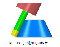 这一功能突出地表现在带角度表面的侧面铣削加工方面。如图1-19所示圆锥面加工,若在三轴机床上加工,需要使用球头铣刀来成型,而使用五轴机床切削此类表面时,可以使用圆柱立铣刀的侧刃来加工,一方面大大地提高了加工效率,另一方面,这种工艺也可以消除由球端立铣刀加工所造成的肋骨状纹路,达到较为理想的表面质量,减少因清理表面而增加的人工铣削和手工作业量。
