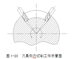 五轴加工通过改变刀具切削工作部位来延长刀具的使用寿命。虽然使用高速加工机床可以获得快速的切削效率,缩短工时,但刀具磨损往往只发生在刀尖,使得刀具的有效寿命缩短了。使用五轴加工机床进行加工时,刀具除了刀尖切削外,更多时候是使用刀具侧刃来切削,如图1-20所示,所以刀具利用率提高了很多,也因此提高了刀具的整体寿命。